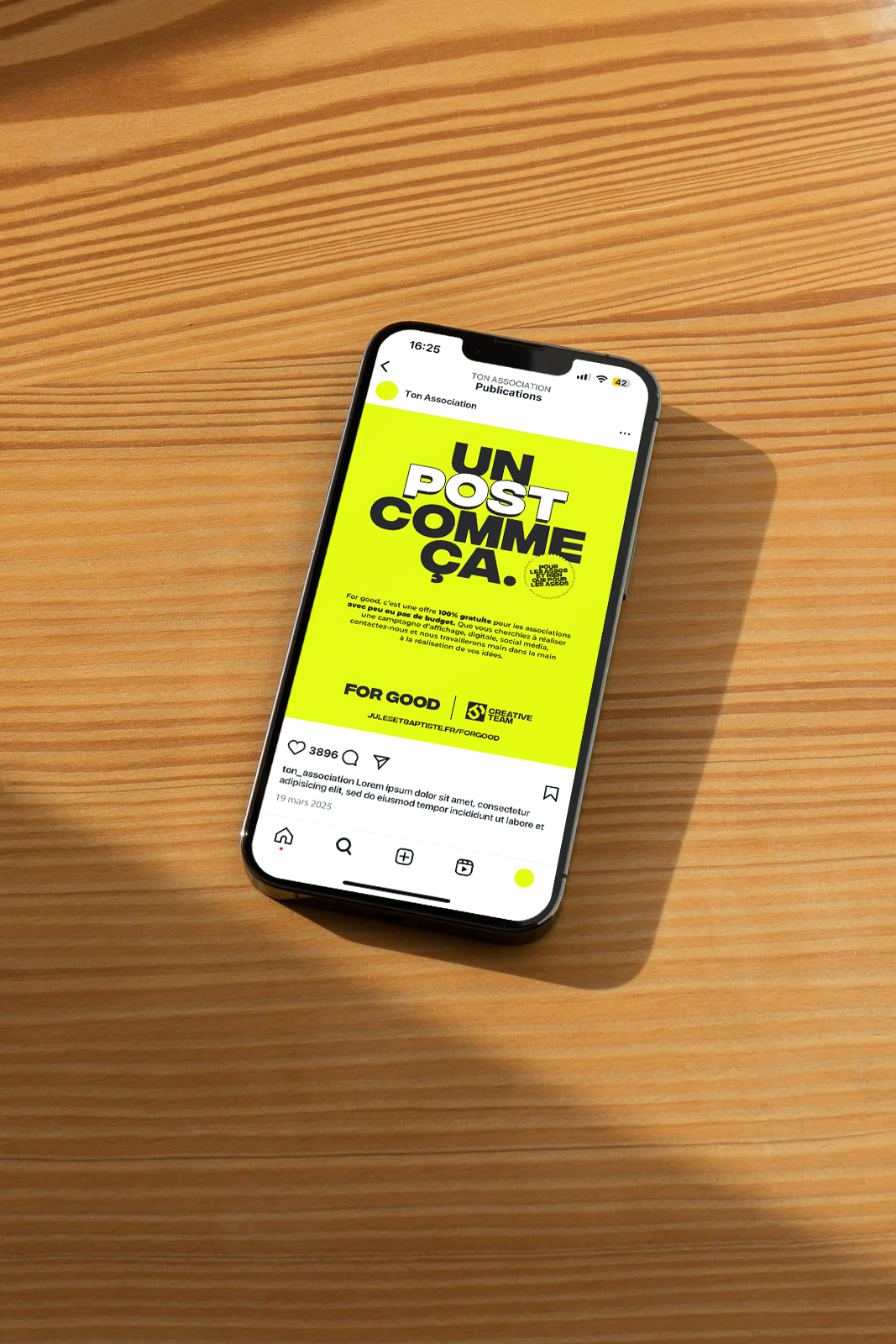 Ce branding et ses différentes déclinaisons visuelles ont été conçus pour transmettre en un clin d’œil l’essence de l’offre FOR GOOD, adaptée à chaque média. Il faut que les associations comprennent directement ce que FOR GOOD peut leur faire pour leur association.